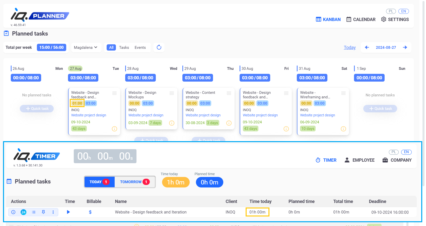 When you schedule a task for the current day, it will be automatically added to today's task list in the IQ.Timer app. The app features a stopwatch function that allows you to track the time spent on completing the task. The recorded time is automatically logged in IQ.Planner.