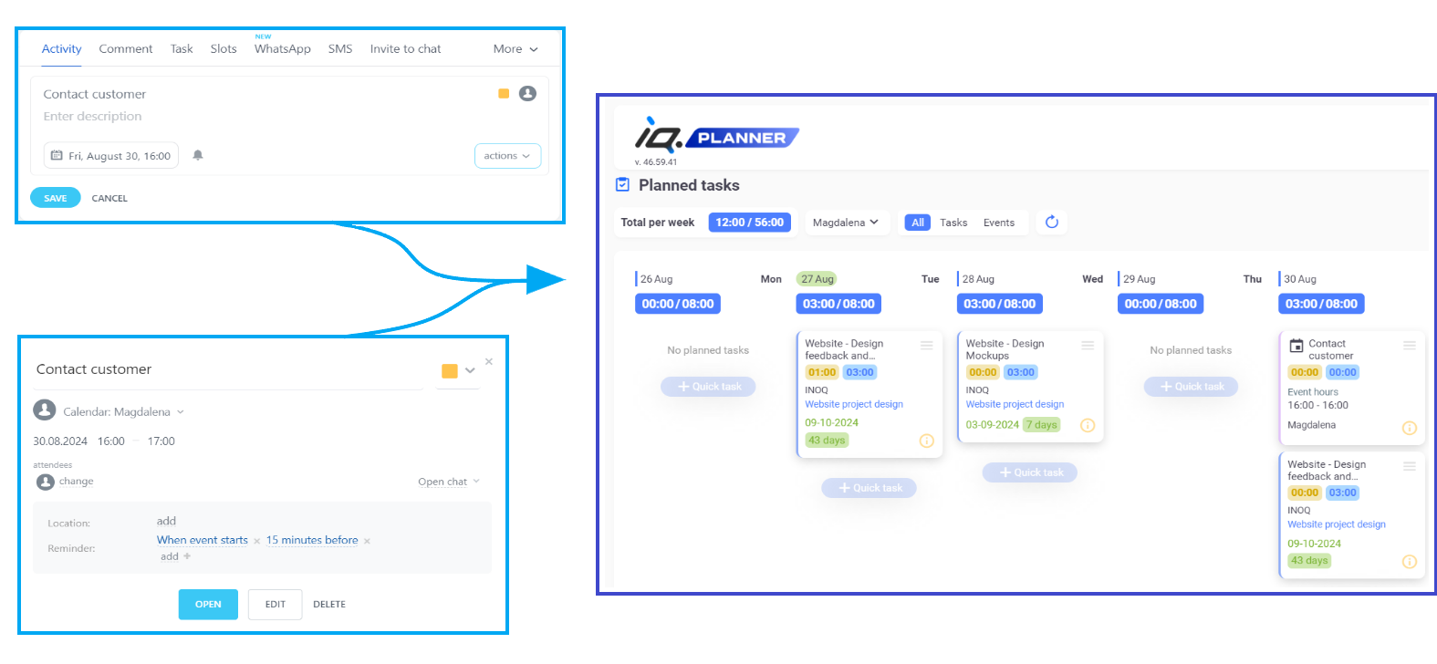 Plan and manage Events and CRM Activities directly in Bitrix24, and any changes will be automatically reflected in the daily schedule in IQ.Planner.