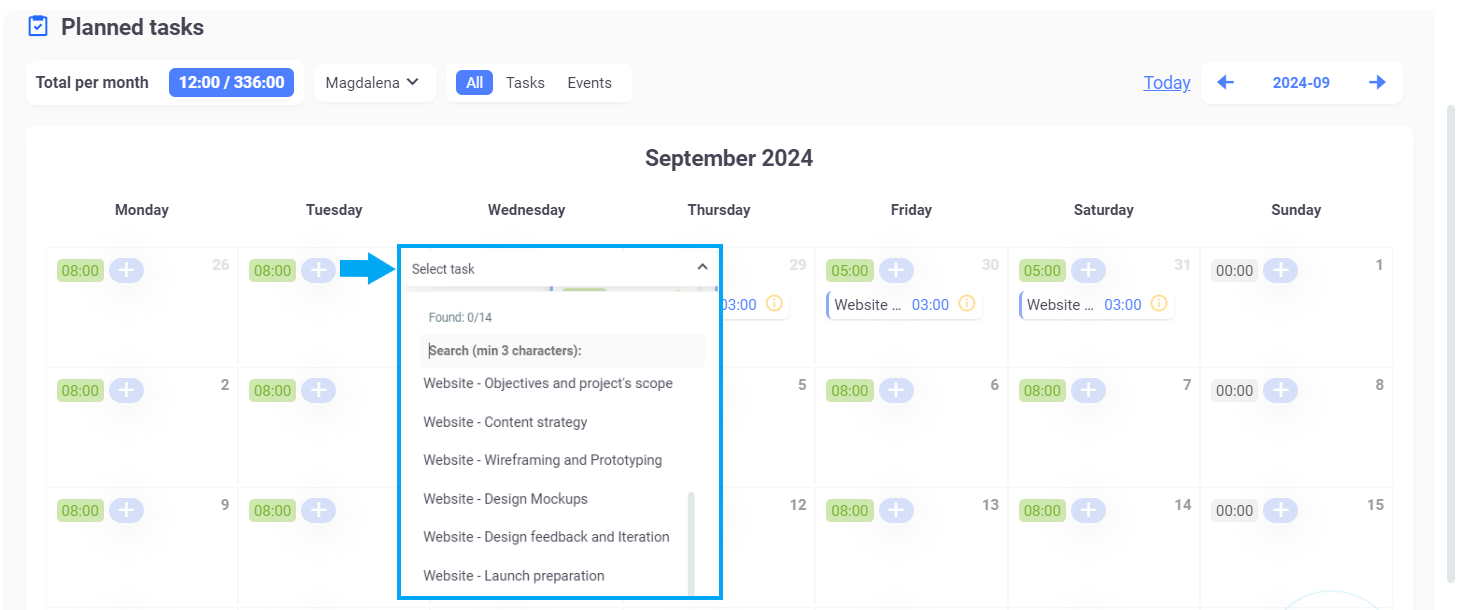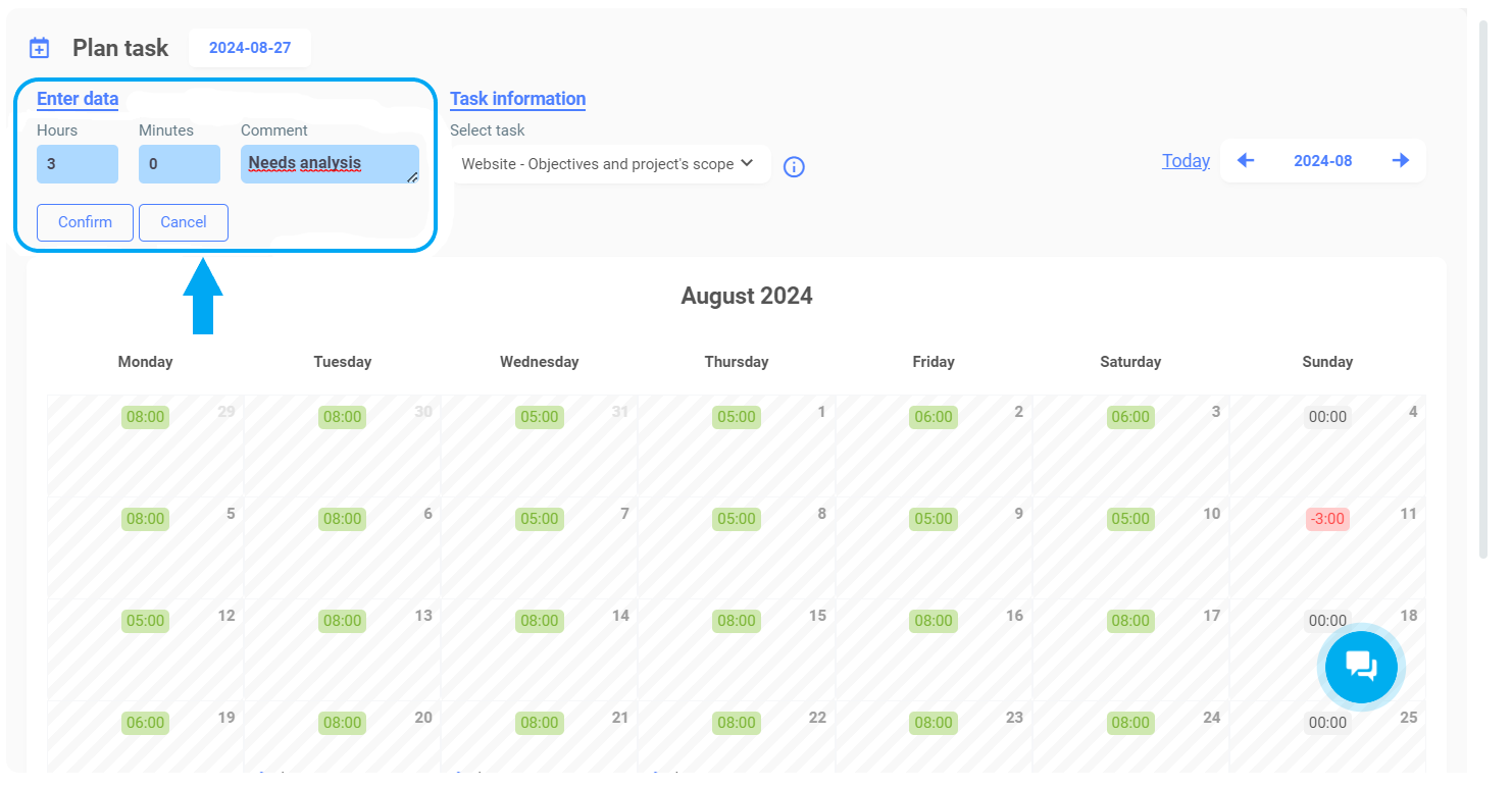 After selecting a task from the list, a calendar will appear where you can allocate time for completing the task on a specific day and add a comment detailing what needs to be done.