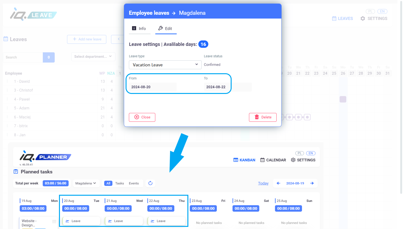 Once your vacation request is approved in the IQ.Leave application, your absence will be automatically updated in IQ.Planner. Additionally, during the assigned vacation period, your ability to schedule tasks for those days will be blocked, simplifying project and schedule management