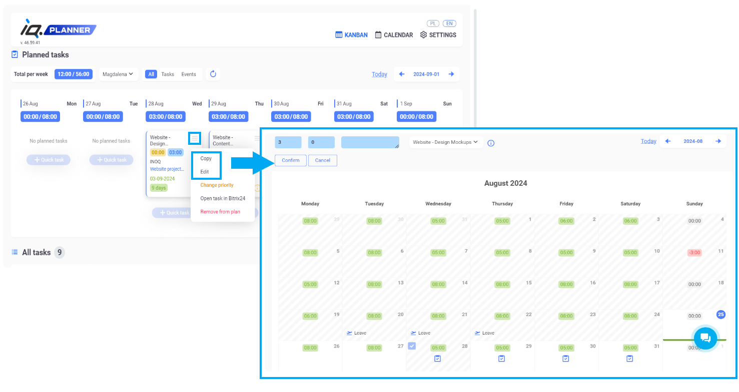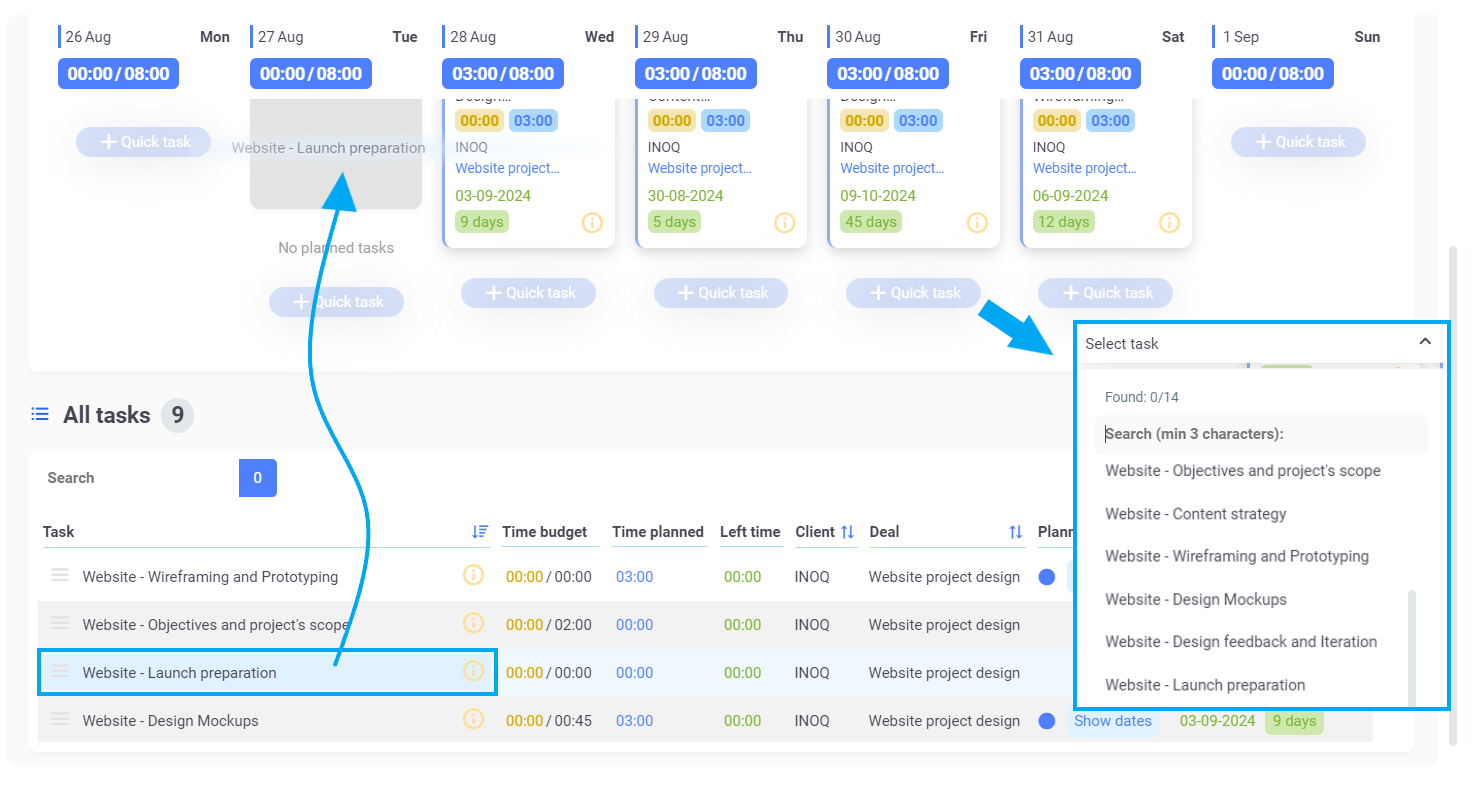 In IQ.Planner, you can schedule all tasks created in Bitrix24. In the Kanban view, simply drag the desired task from the task list to the day you want to schedule it. You can also use the "Quick Task" button and select a task from the list