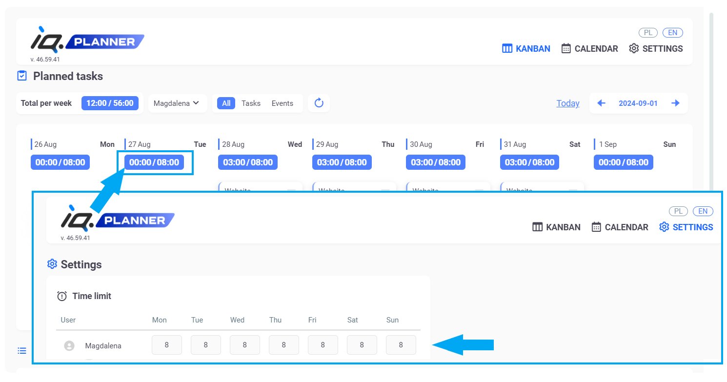 In IQ.Planner, you can flexibly manage employees' effective working hours. To set an hourly budget for each employee, go to "Settings" and enter the appropriate time values for each day. When assigning tasks, the hourly budget will be automatically reduced by the planned time for task completion, showing how many hours are already scheduled for the employee and how many are still available.